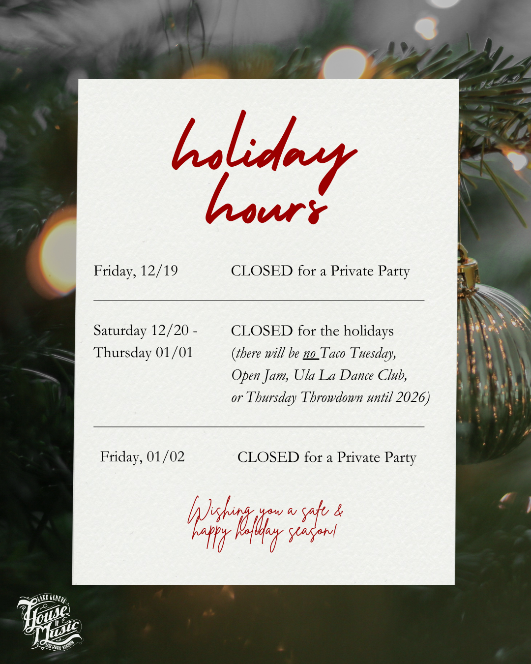 We’re currently on our holiday break, staying busy with maintenance and a website re-design! There will be no evening entertainment or events (besides private parties) until 2026.